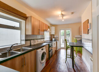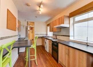 This house offers a large communal area spread across the ground floor. There is a large modern kitchen with lots of storage space and appliances such as 2 fridge freezers, a cooker and a washing machine. There is also a breakfast bar in this area.